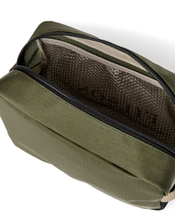 This dopp kit is built from 300D recycled polyester that’s coated with TPU for exceptional water resistance. It sheds rain. spills. and splashes with ease. The base is reinforced with heavier 600D recycled polyester. also TPU-coated. for added structure and long-term durability. Inside. two organizing pockets keep small items in place. One is mesh for quick visibility. and one secures with a zipper. The interior is fully lined to help contain leaks and make cleaning easy.