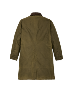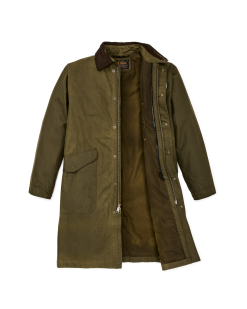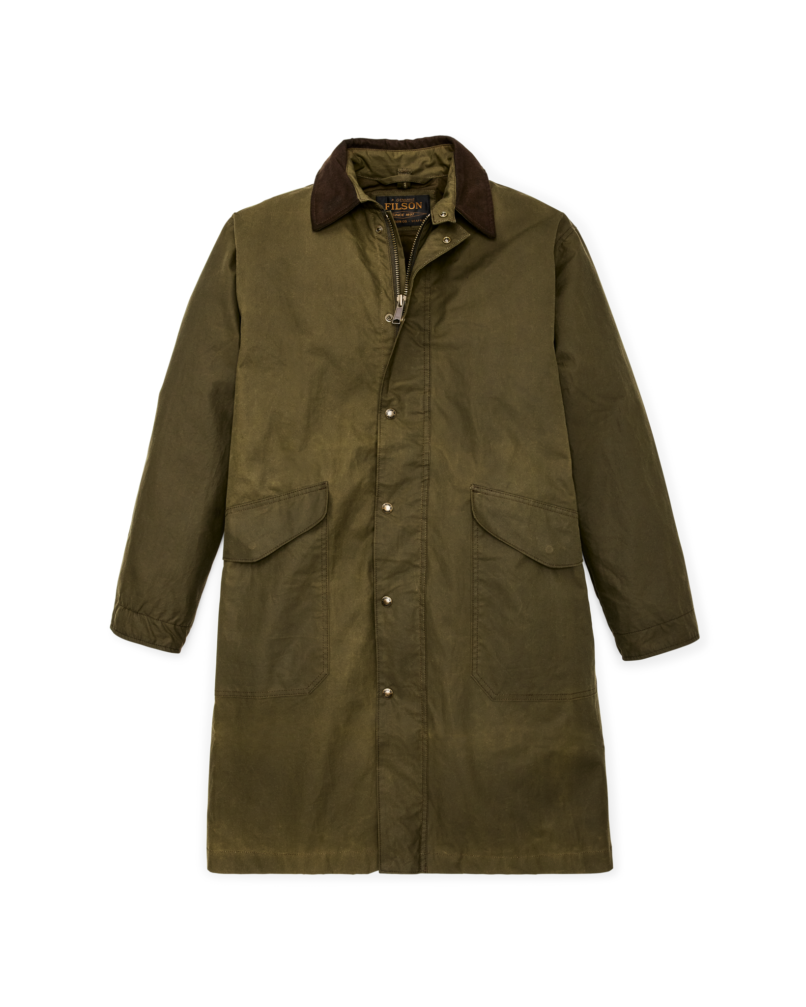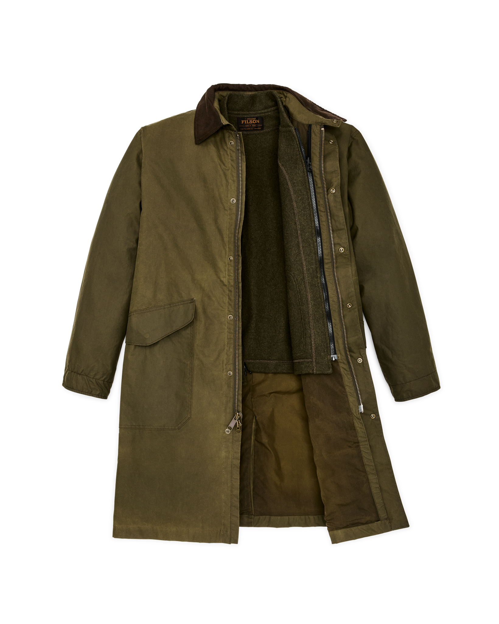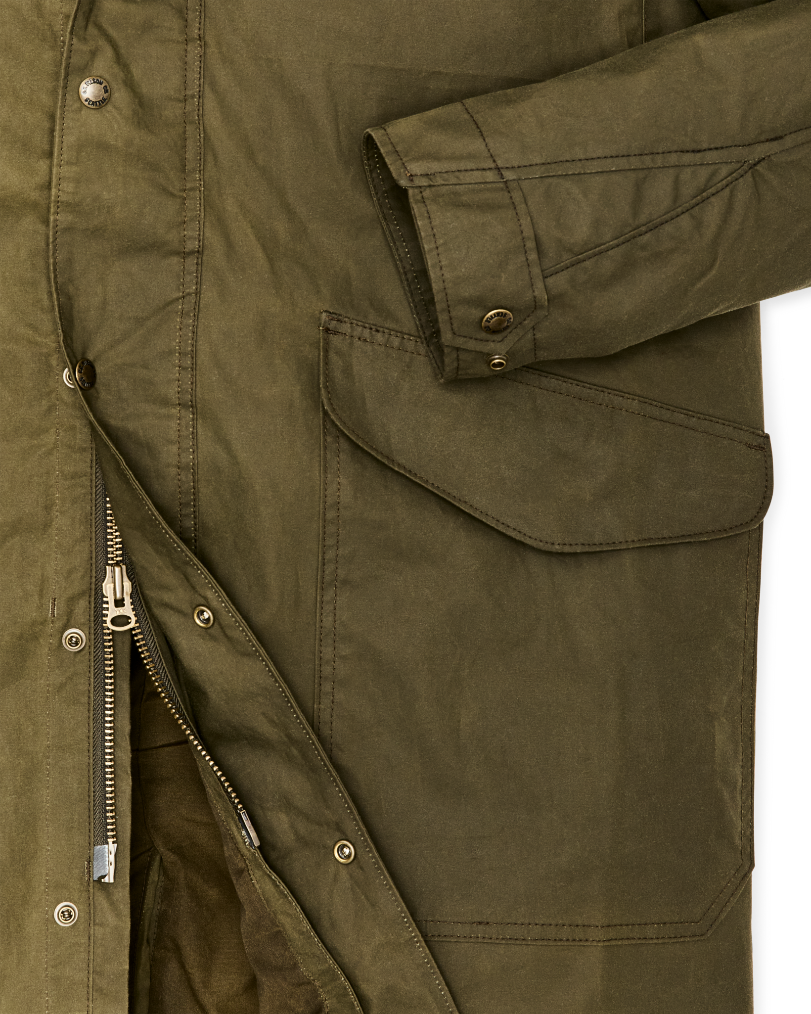 A timeless design made with heritage fabric. The mid-thigh length provides weather protection where shorter jackets leave off. Our signature 8-oz. Cover Cloth waxed cotton can be rewaxed over the years to maintain its water resistance. The front zipper with storm flap is two-way and extends to the hip for ease of motion. A long slit in the rear hem allows it to flare while seated. The torso is lined with unwaxed Cover Cloth and the sleeves with polyester for ease of layering. The collar is lined with cotton Moleskin for comfort. The interior features a security pocket and a zipper for compatibility with Filson zip-in liners. sold separately.