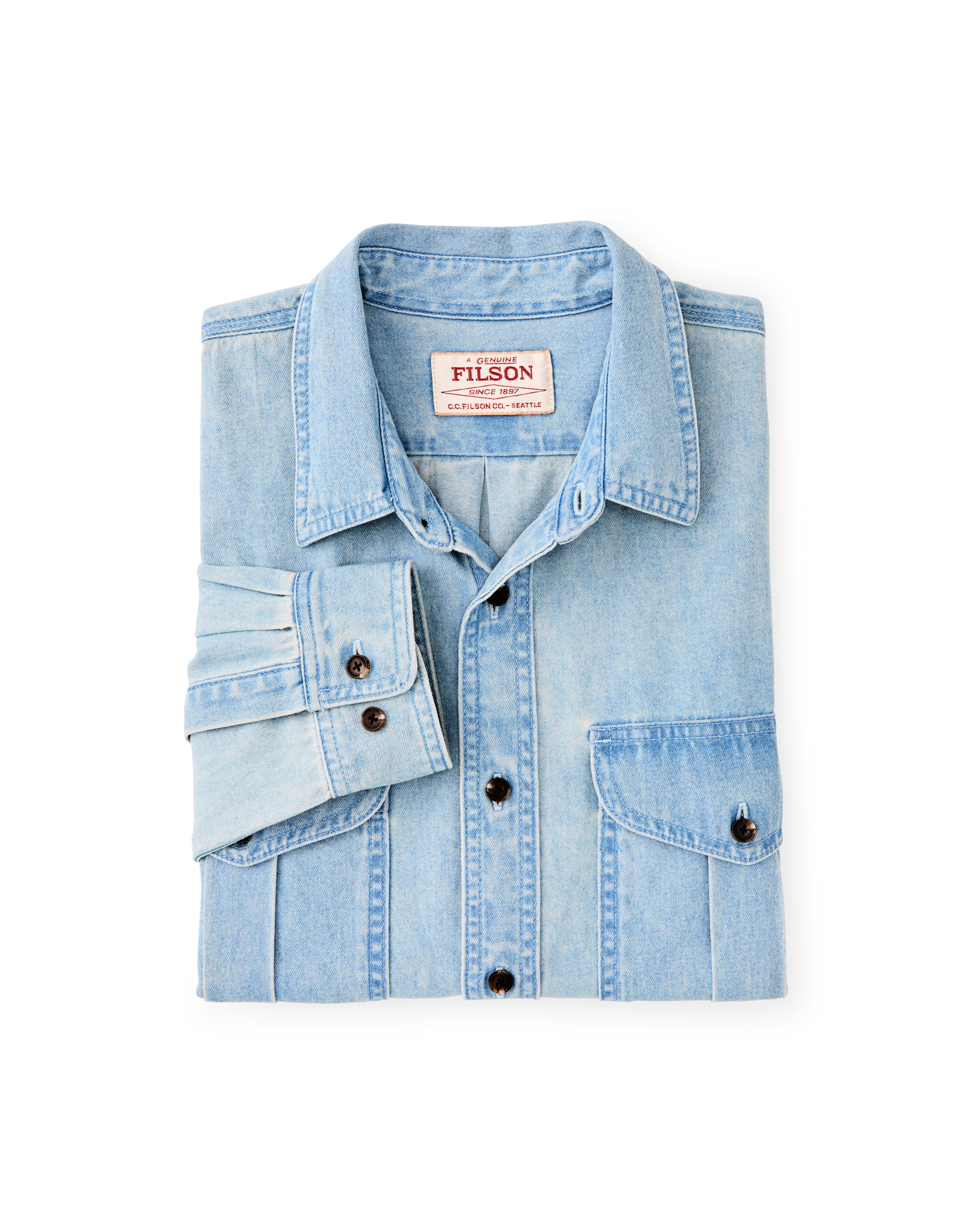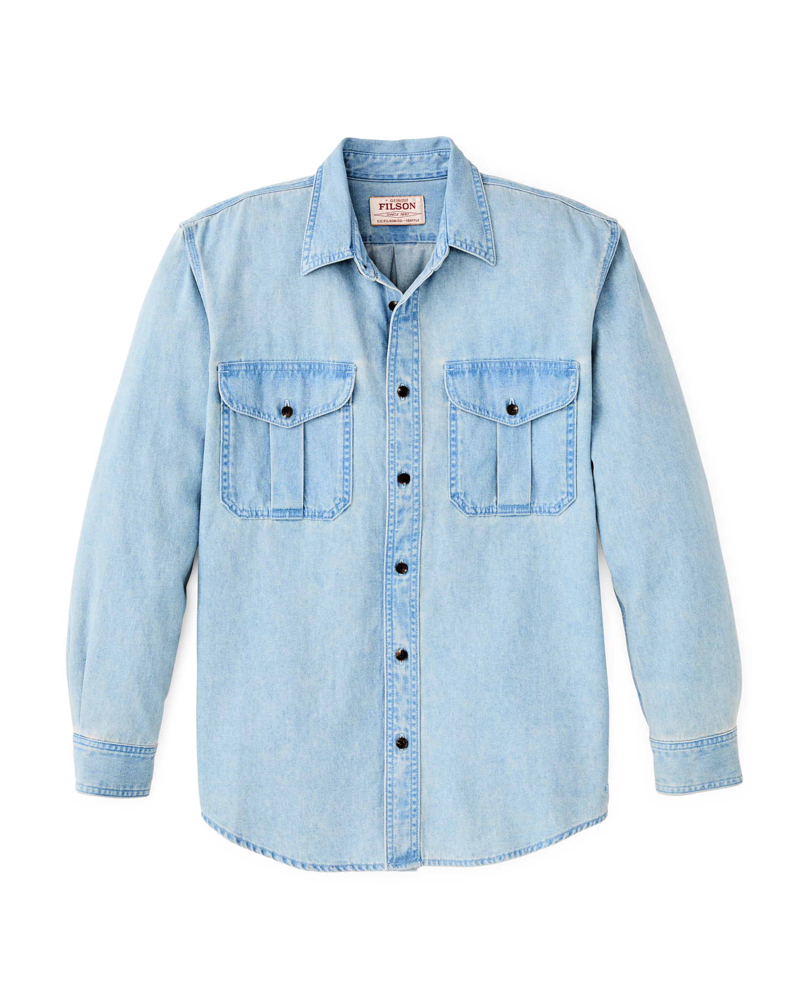 This durable classic is patterned after our iconic Alaskan Guide Shirt. a trusted favorite of bush pilots. ranchers. and sportsmen for thirty years. The 7.5-oz. fabric shares the same 2×1 warp-face twill weave as the strongest jeans. in a weight comfortable for a shirt. Like our original Guide Shirt. the fit is relaxed. with a center-back box pleat for ease of motion. Buttons secure the front. cuffs. and expandable chest pockets.