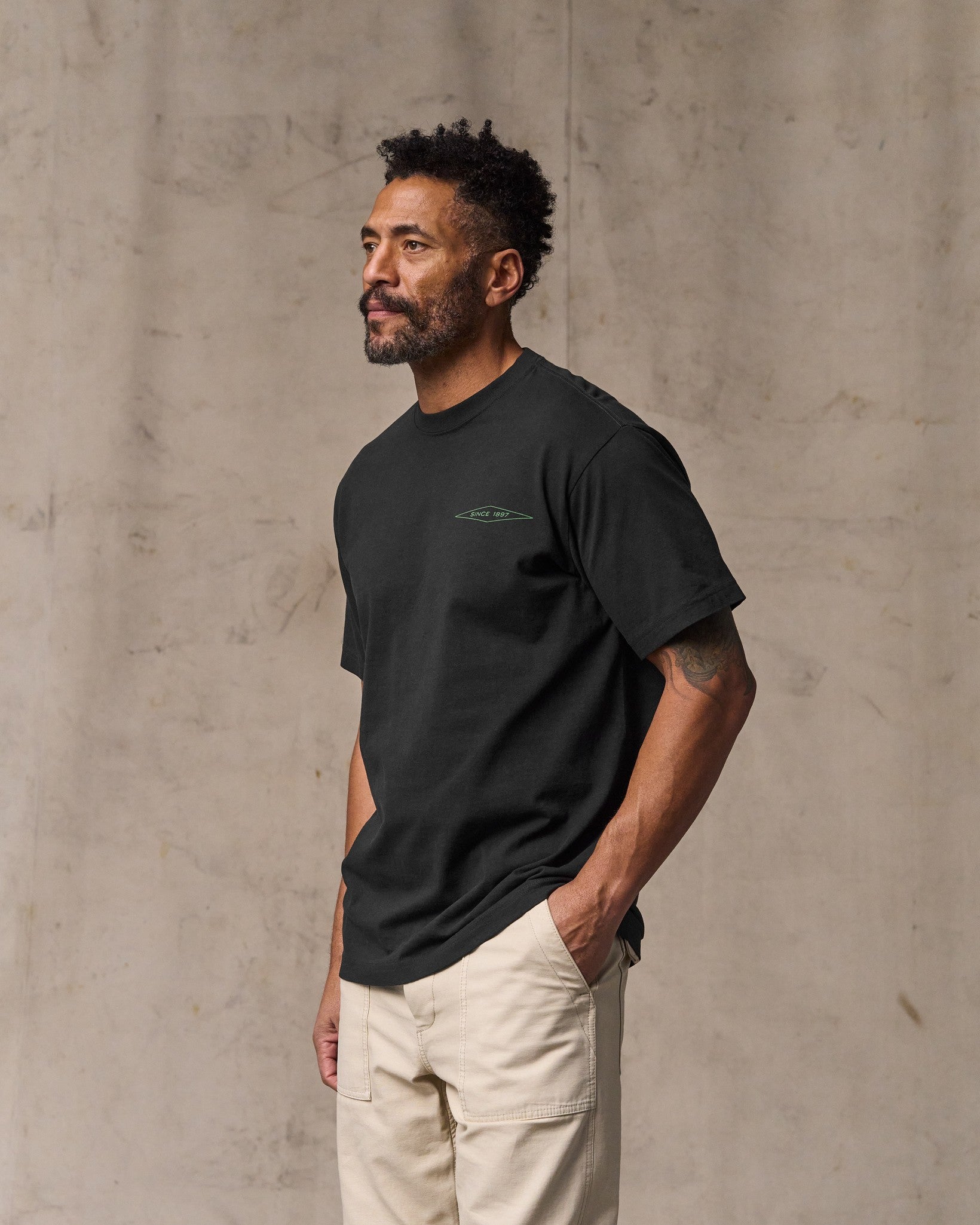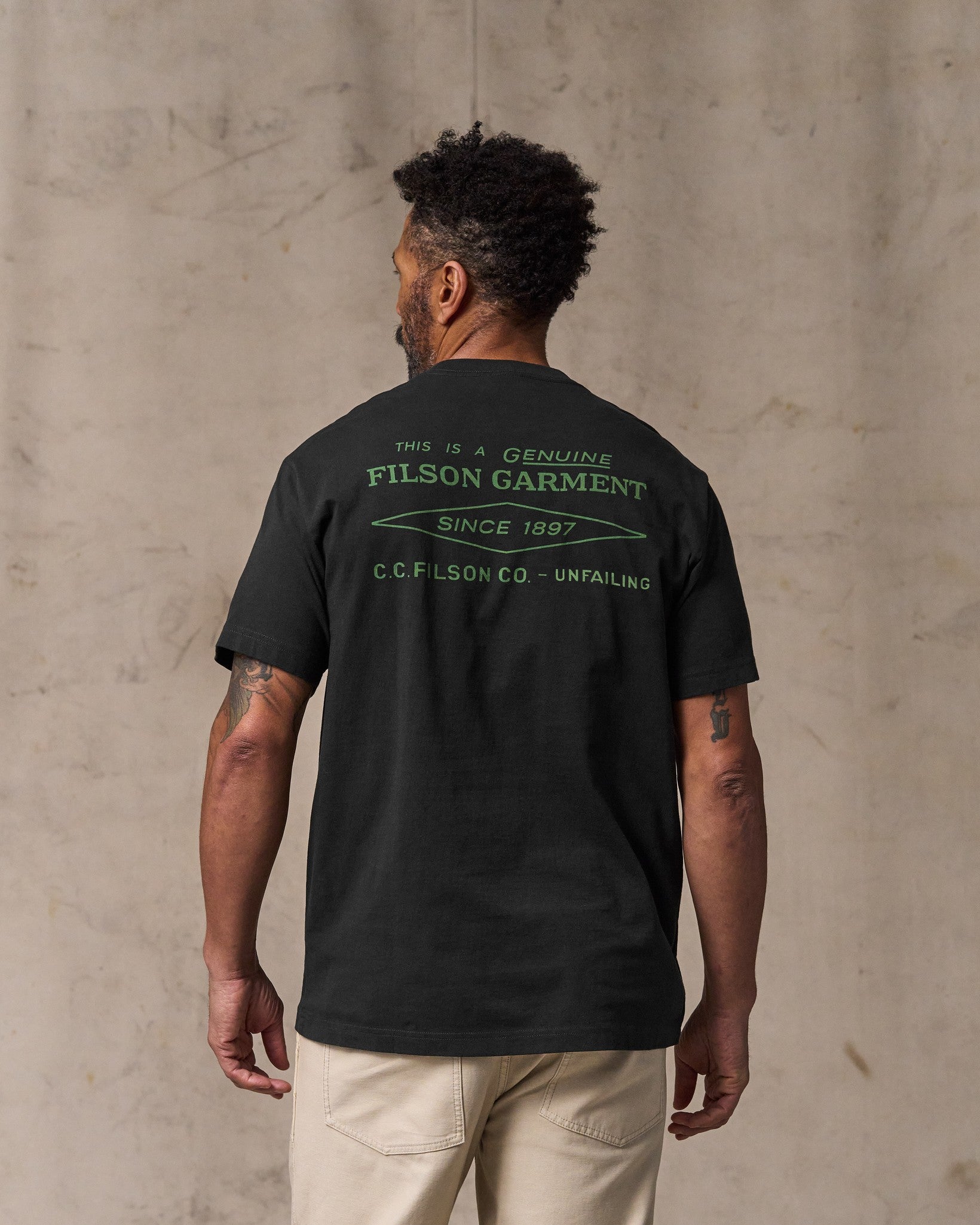 Our Diamond Graphic T-Shirt is made from premium Peruvian cotton for outstanding next-to-skin comfort. The 5.2-oz. fabric is comfortable in the summer heat or as a first layer when the temperature drops. The 1×1 rib-knit collar retains its shape. Custom Filson logo graphic.