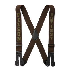 Sometimes it takes more than a belt to keep your cargo in place. These wide elastic suspenders have riveted leather tabs for attaching to suspender buttons and an X-cross design in the back for added durability. Inspired by traditional lumberjack suspenders. each front tab attaches to two buttons while each back tab attaches to one. They feature Filson branding in the front sturdy metal hardware.