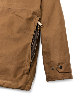 This water-resistant waxed-canvas jacket combines design elements of our proven raincoats with the field functionality of our vintage hunting jackets. It’s made with our signature Tin Cloth waxed canvas. the iconic fabric that’s provided weather protection in the rain-soaked Pacific Northwest forests for a century. The caped shoulder design minimizes seams exposed to driving rain. Dividers in the expandable front pockets were originally designed to separate live and spent shotgun shells. and work just as well for keeping essentials organized. The zippered back pocket is lined with nylon for carrying game or bulky items. The high-set hand pockets and collar are lined with warm Mackinaw Wool. Select Filson liners can be fastened with the interior zipper. Drawcord-adjustable waist and hem.