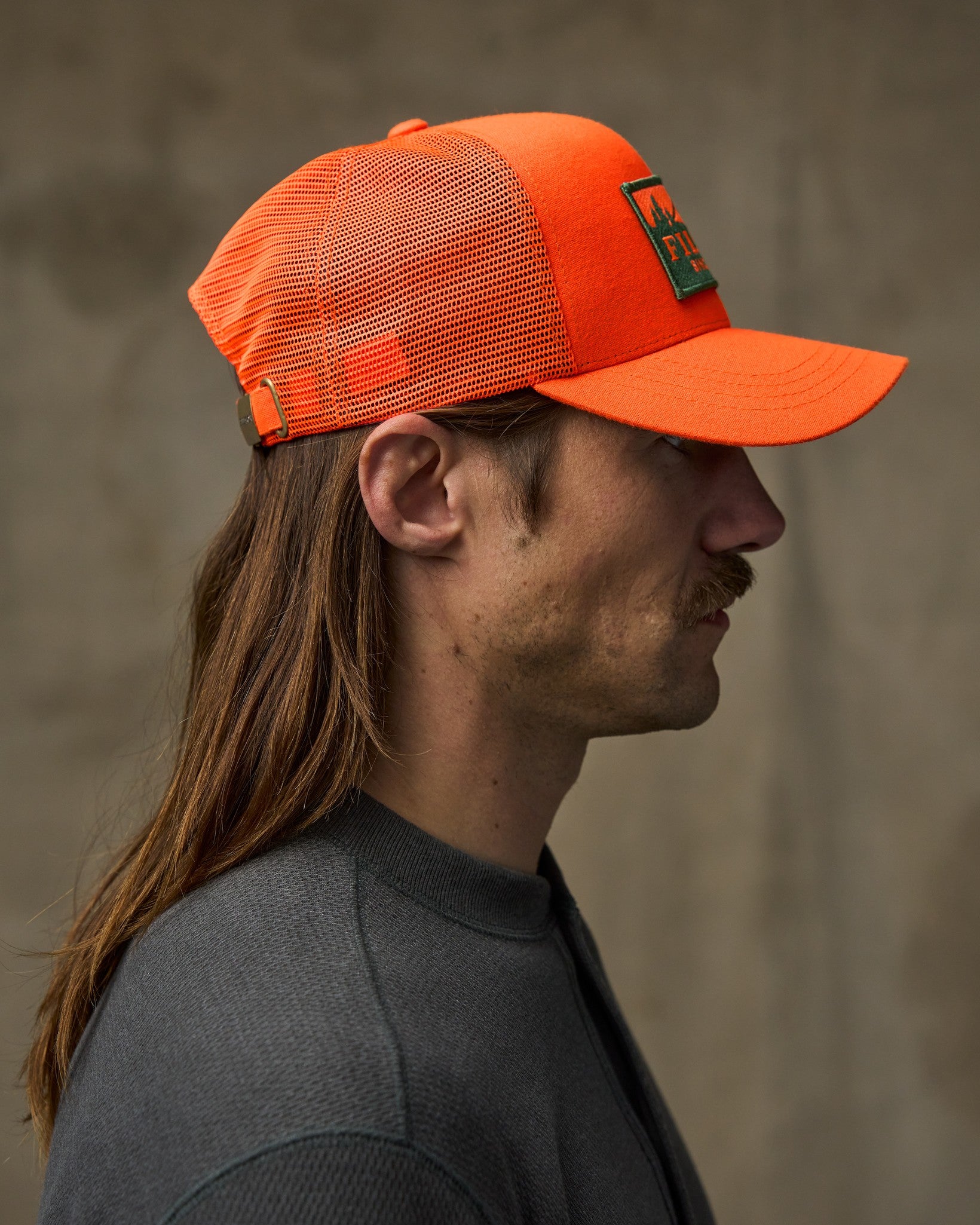 Our classic 6-panel cap hugs your head comfortably. with an adjustable strap and metal buckle on the back. It features a 3 precurved bill for sun protection and an embroidered logo patch on the front. Made of high-visibility Blaze Orange fabric on the front with a mesh back for breathability. safety. and comfort in the field.