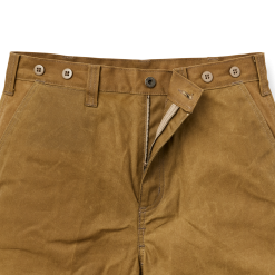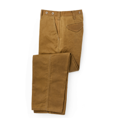 Our Oil Finish Single Tin Pants earned their reputation for unfailing durability and protection from rain. snow. and mud during the Pacific Northwest’s logging boom of the 1920s. Still a staple in the backlands. our Tin Pants continue to protect foresters. hunters. and tradesmen. Their weight is comparable to a pair of sturdy jeans. with a tight weave that resists punctures. tears. and abrasion. The canvas duck is thoroughly saturated with wax under heat and pressure for water resistance. A pair hangs in the Filson offices that has faithfully served through twenty upland hunting seasons. The fit is roomy through the seat and thighs for the freedom of motion to climb. squat. and scramble. Zippered fly and snapped waistband. Includes suspender buttons.