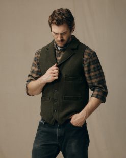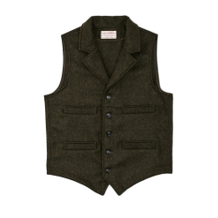 Our Mackinaw Wool Western Vest shrugs off wind and light rain while providing warm insulation. wet or dry. The notched lapels and pointed hem are a nod of respect to the bold pioneers who settled the West. Vests. known as waistcoats in Britain. were considered a requirement for proper attire in those days. The front pockets were sized and located for quick access to timepieces. Those same features that made the vest an indispensable garment on the range make our Western Vest a companion no matter where your journey leads.