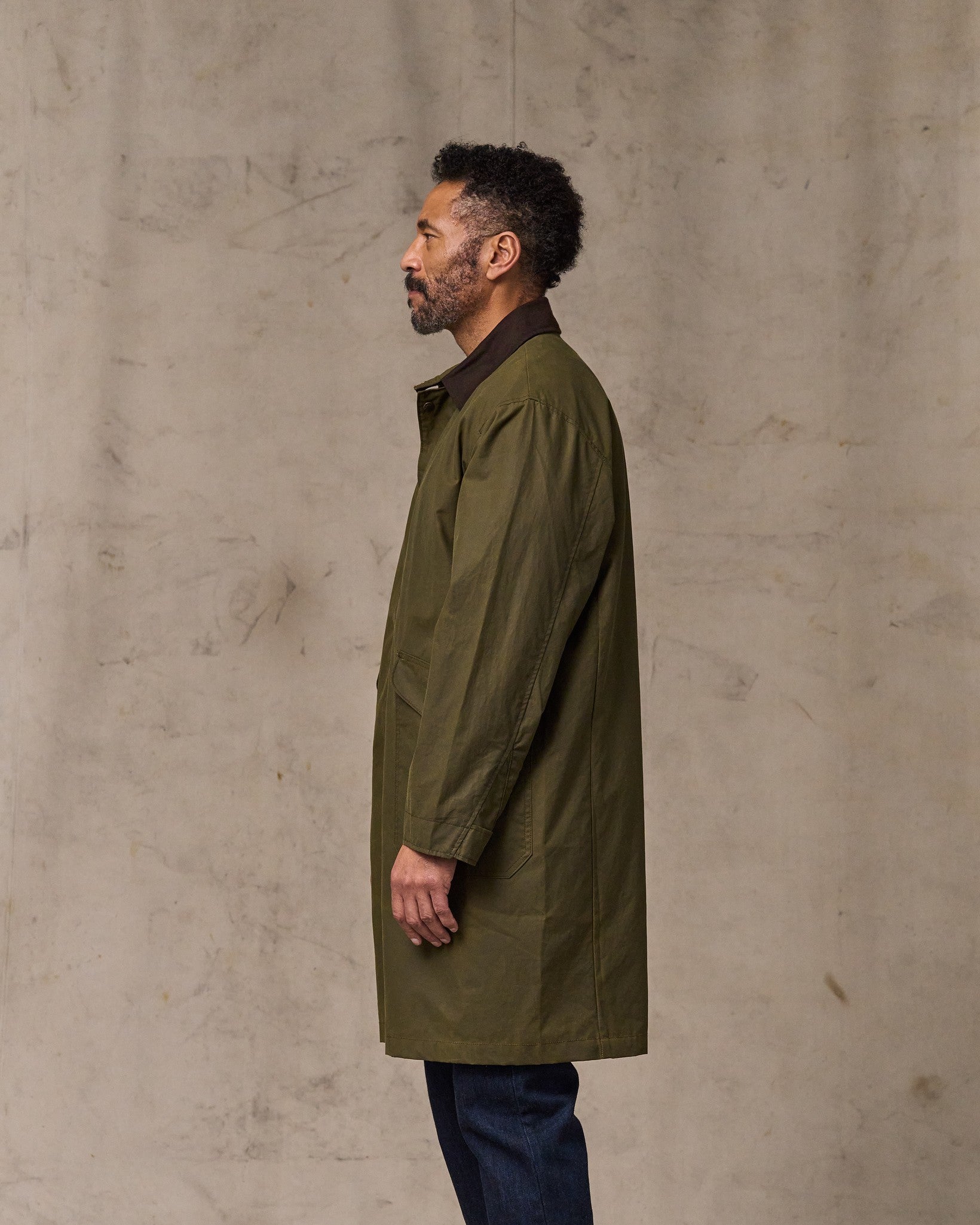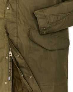 A timeless design made with heritage fabric. The mid-thigh length provides weather protection where shorter jackets leave off. Our signature 8-oz. Cover Cloth waxed cotton can be rewaxed over the years to maintain its water resistance. The front zipper with storm flap is two-way and extends to the hip for ease of motion. A long slit in the rear hem allows it to flare while seated. The torso is lined with unwaxed Cover Cloth and the sleeves with polyester for ease of layering. The collar is lined with cotton Moleskin for comfort. The interior features a security pocket and a zipper for compatibility with Filson zip-in liners. sold separately.