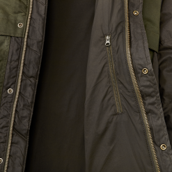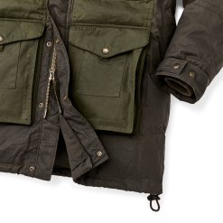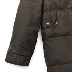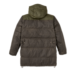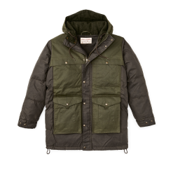 Our warmest coat. this parka is made with our signature waxed-cotton Cover and Shelter Cloths for water resistance and insulated with lightweight. warm 650-fill-power down. The attached hood is lined with wool for warmth. with an adjustable visor to keep rain out of your eyes. The snap-closure front and pockets are easy to operate even while wearing gloves.Â