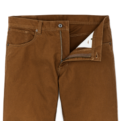 Our Dry Tin Cloth 5-Pocket Pants are made with the unwaxed version of our iconic canvas that’s provided protection from brush. abrasion. and hard use for decades. They’re lighter than many jeans. with durability that is unrivaled. Like a good pair of boots. they break in and soften with wear. The leg cut is straight. with room in the thighs for easy movement. A double-layer heel guard adds structure and durability. Zippered fly and snapped waistband. Reinforced pockets.