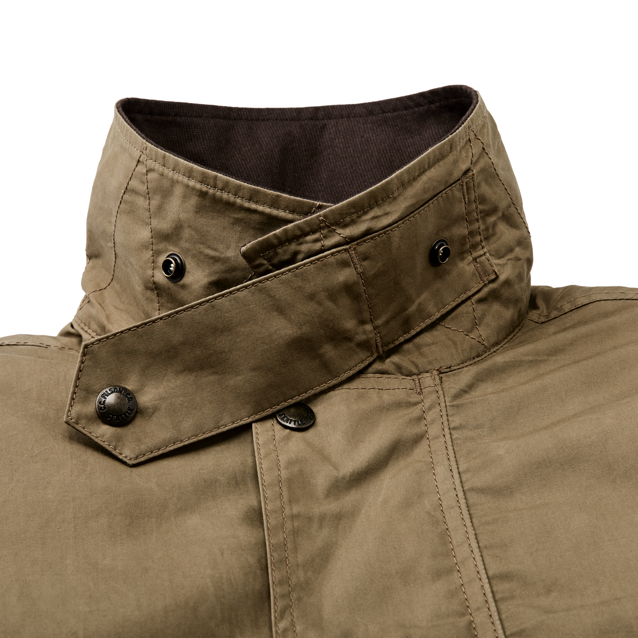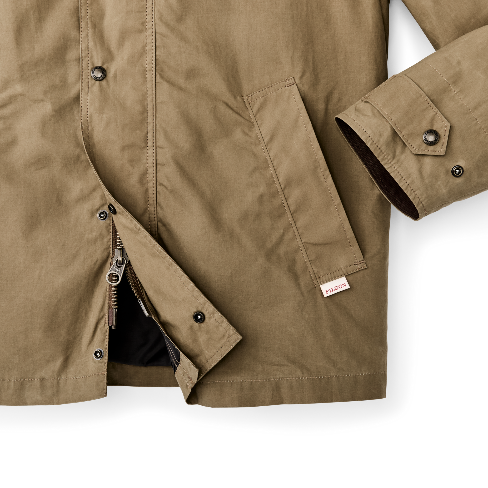 Across the lower back is a lined reach-through pocket for small game or accessories. and on the front. the welted hand pockets from our classic field jackets. The cut is hip-length and well-suited for daily use when you’re not in the field. It’s lined with a combination of lightweight canvas and polyester taffeta. The front zipper is protected by a storm flap and the collar is lined with cotton cavalry twill for next-to-skin comfort. Snap tabs secure the adjustable cuffs and the collar when turned up. Interior stow pocket.