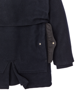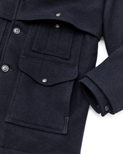 The four pockets. full-width back pocket. and caped construction creates two full layers of 24-oz. wool over the shoulders. arms. and torso for warmth. The rear hem is slit allows the coat to flare when seated for non-binding comfort. Fingertip length.