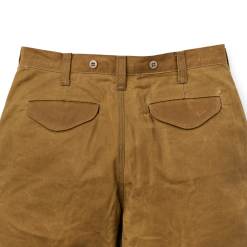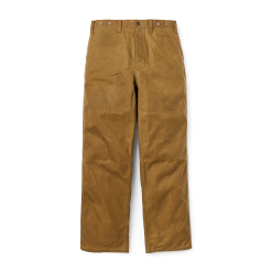 Our Oil Finish Single Tin Pants earned their reputation for unfailing durability and protection from rain. snow. and mud during the Pacific Northwest’s logging boom of the 1920s. Still a staple in the backlands. our Tin Pants continue to protect foresters. hunters. and tradesmen. Their weight is comparable to a pair of sturdy jeans. with a tight weave that resists punctures. tears. and abrasion. The canvas duck is thoroughly saturated with wax under heat and pressure for water resistance. A pair hangs in the Filson offices that has faithfully served through twenty upland hunting seasons. The fit is roomy through the seat and thighs for the freedom of motion to climb. squat. and scramble. Zippered fly and snapped waistband. Includes suspender buttons.