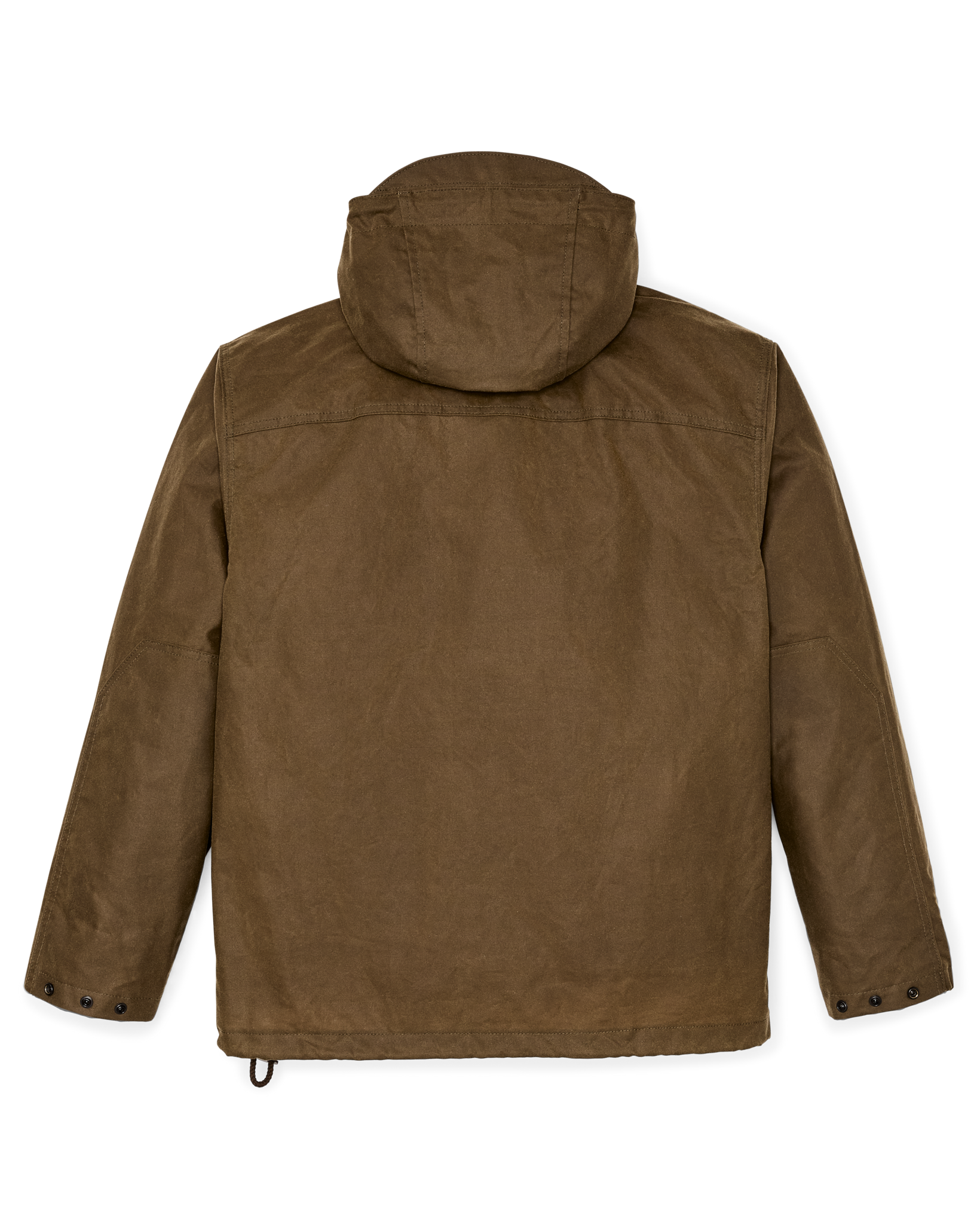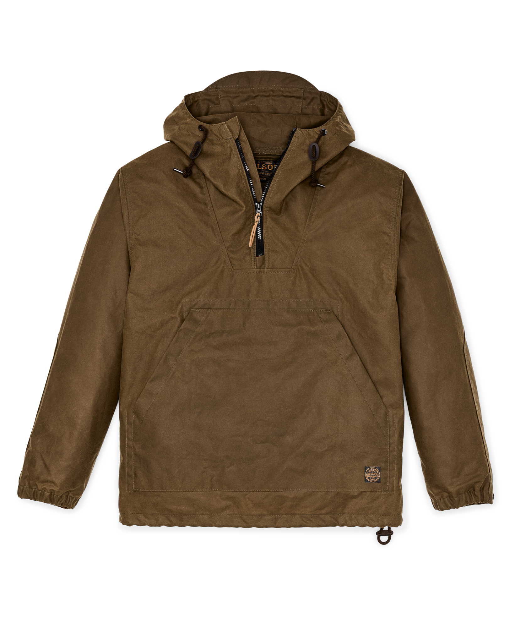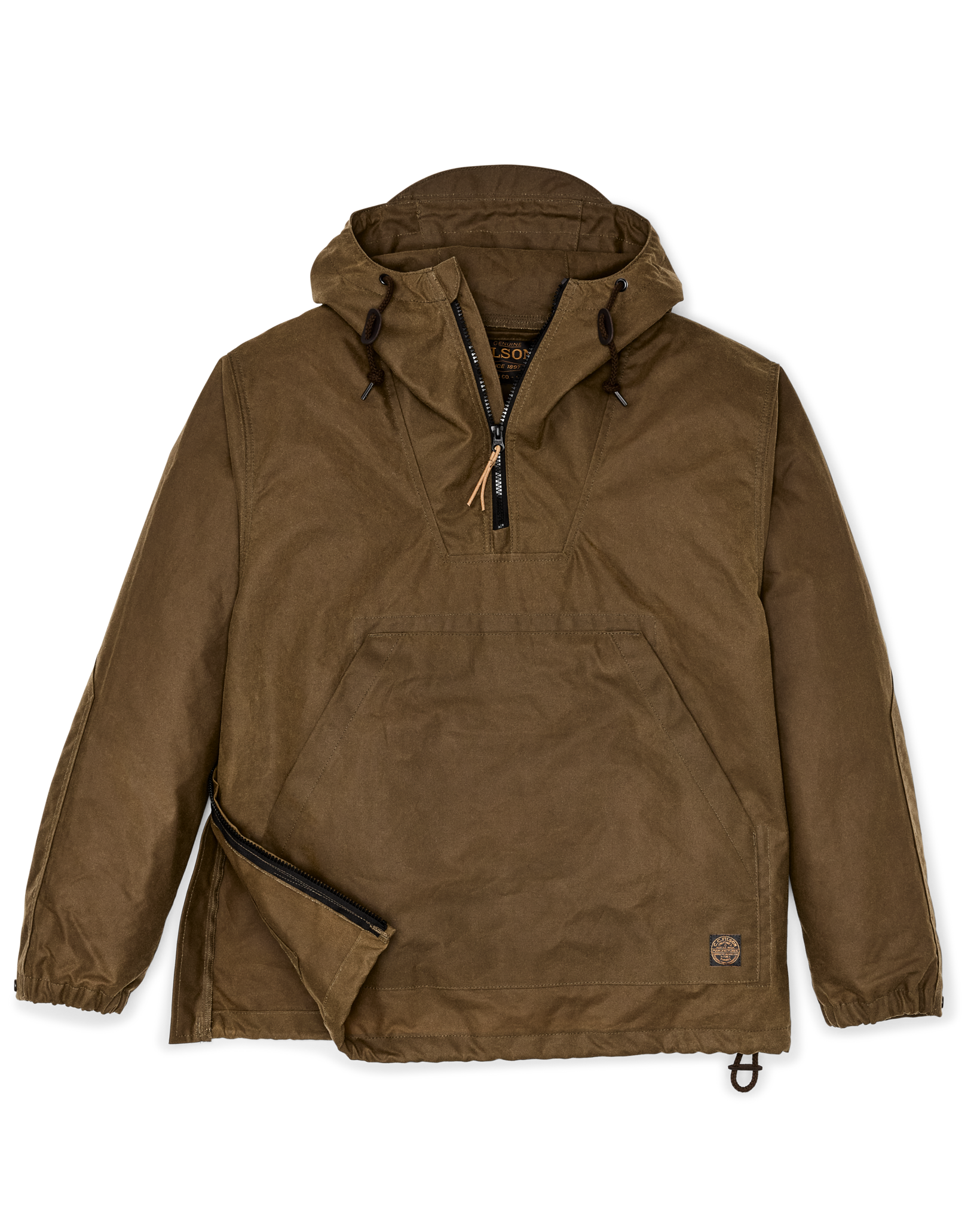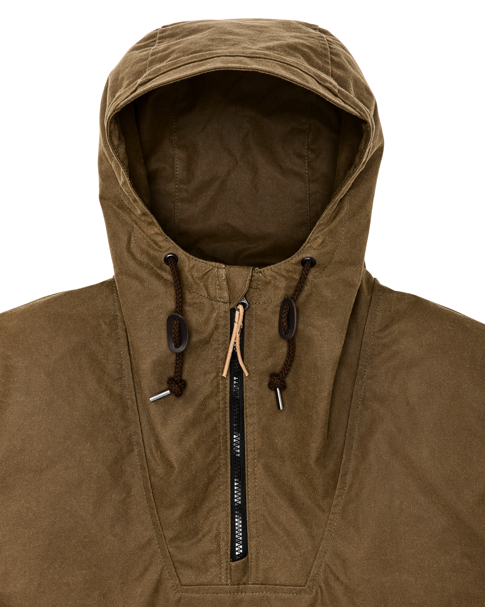 Our Shelter Cloth Waxed Anorak combines the water resistance of waxed cotton with the simplicity of your favorite hoodie for straightforward weather protection. A quarter-length front zipper features a zipper garage to prevent pinching. Inside the large center-kangaroo pocket is a zippered security pocket. The forearms are reinforced with an additional fabric layer for added durability. and feature snap-adjustable cuffs for a custom fit. Side-seam zipper for easy on and off. Drawcord-adjustable hem and hood.