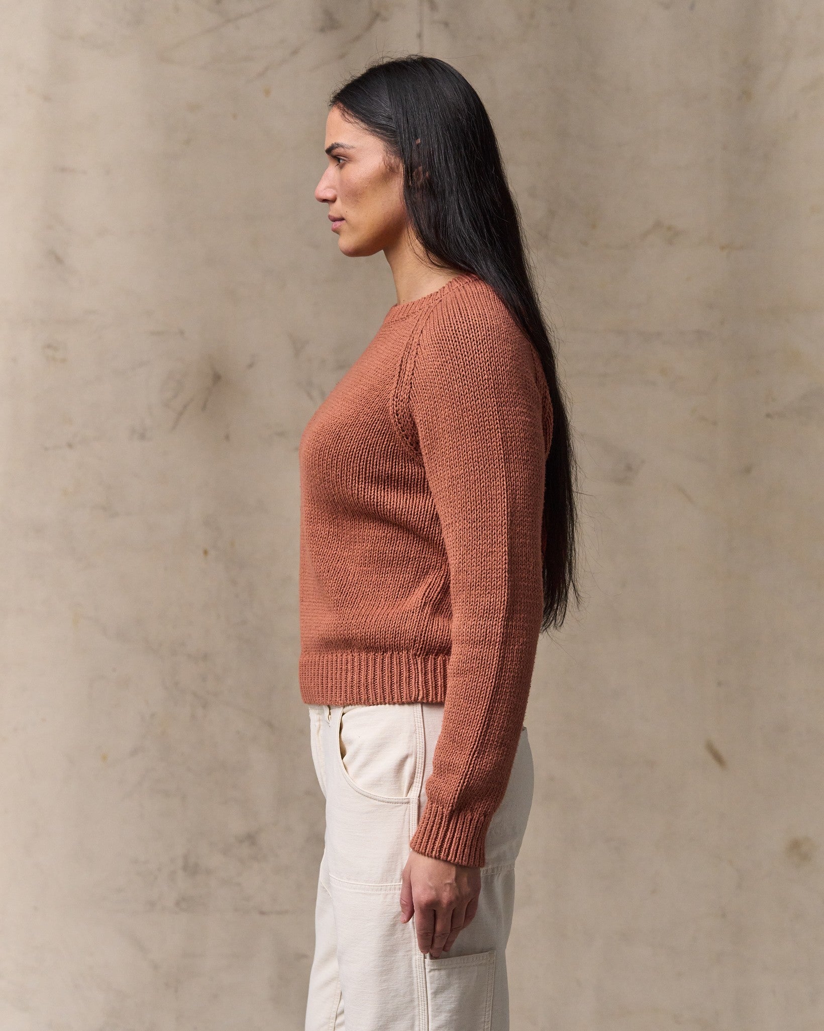 The women’s Cotton Crewneck Sweater is a timeless staple made for everyday wear. Knitted with 3-gauge cotton yarns. it’s thick. durable. and naturally breathable for reliable warmth without excess weight. The yarn construction gives it a rustic texture reminiscent of classic work sweaters built to last.